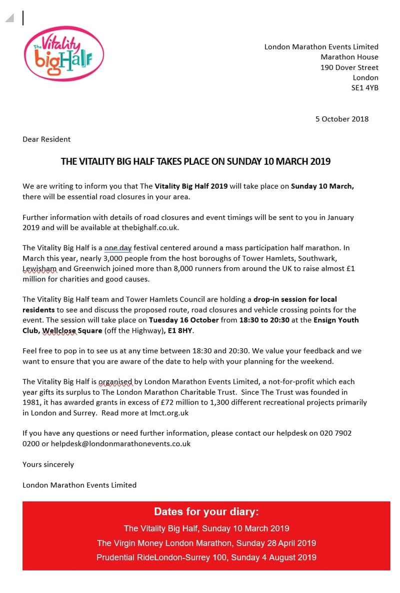 The Ward Panel has just received late notification via a third party that the Vitality "Big Half Marathon" is proposing to stage a repeat event through Wapping on 10th March 2019. It will once again lock down the Ward for vehicular access, and is being staged again despite many resident and local business protests over the inconvenience created by the same event staged in 2018.
